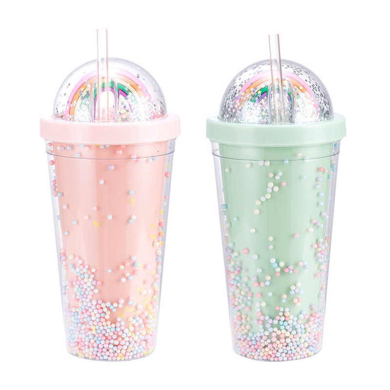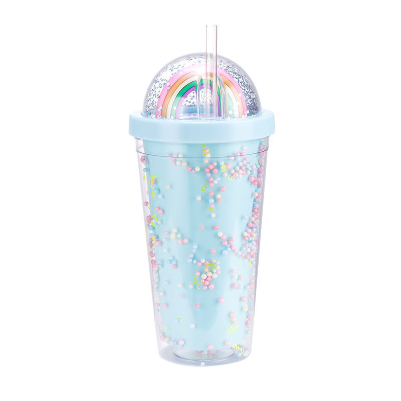 Bicchiere di plastica per succhi di bevande fredde con bolle di paglia arcobaleno