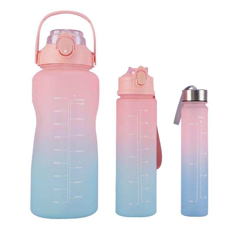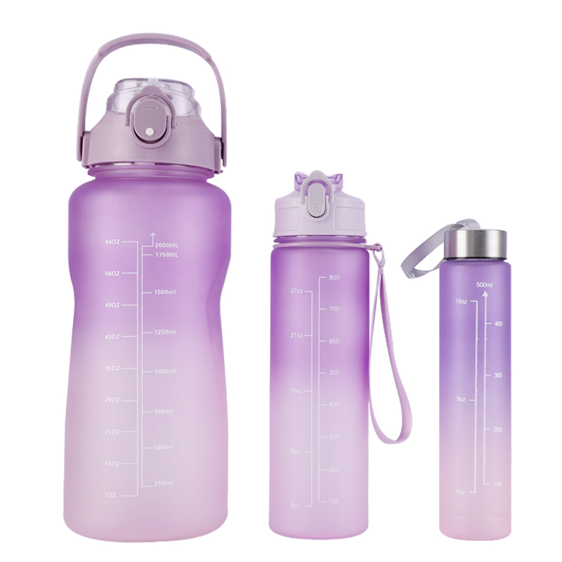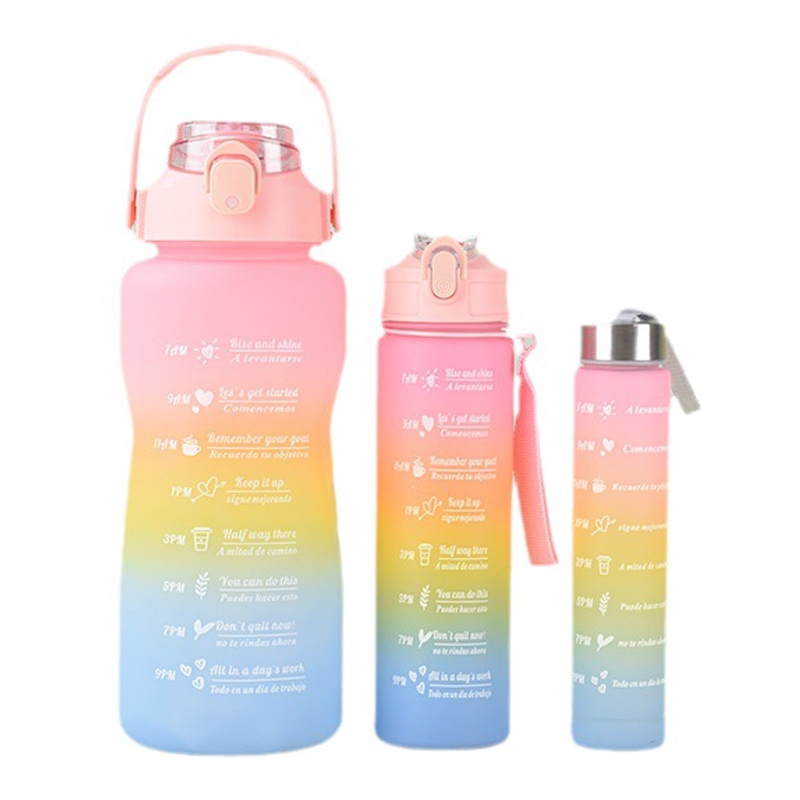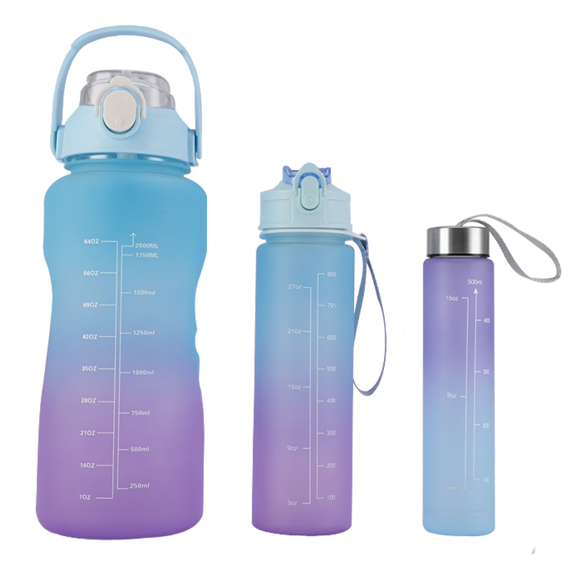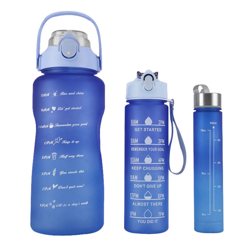 La tazza da 200 ml è dotata di un manico con indicatori del tempo dalle 7:00 alle 21:00 e citazioni motivazionali, perfetta per attività o allenamenti prolungati all'aperto. La tazza da 900 ml è dotata di una cinghia per appenderla e visualizza scale temporali dalle 8:00 alle 19:00 insieme a messaggi stimolanti, rendendola comoda per l'uso quotidiano e aiutando a mantenere le routine di idratazione. La tazza compatta da 300 ml con indicazioni di misurazione chiare è ideale per viaggi brevi o esigenze di idratazione leggera.