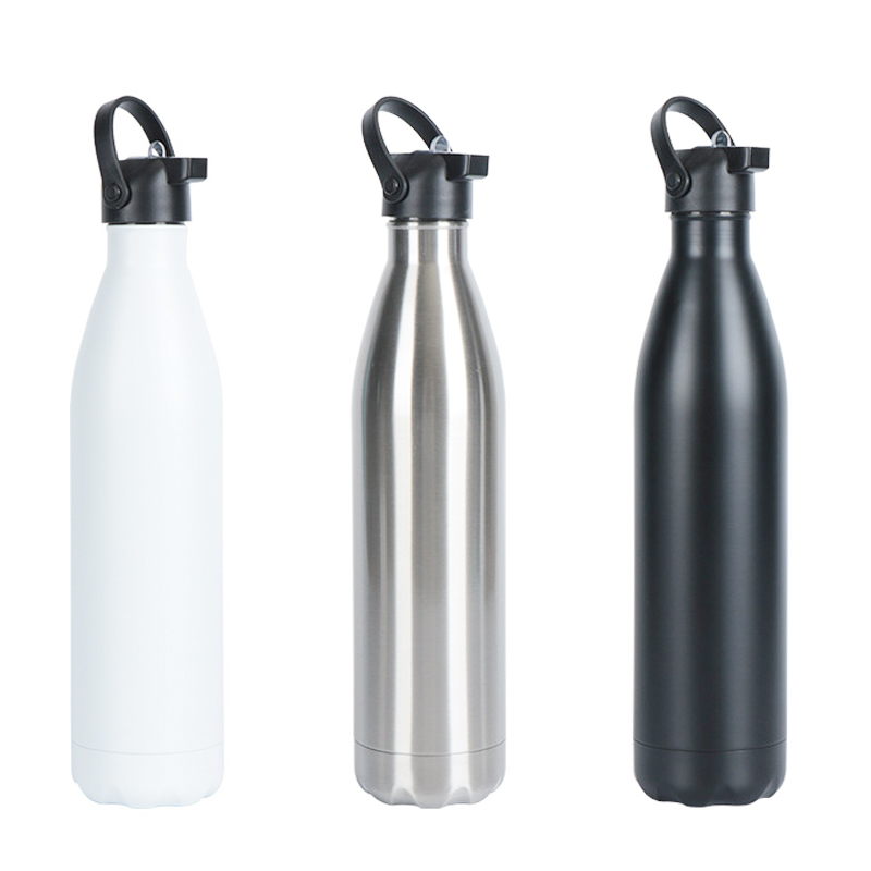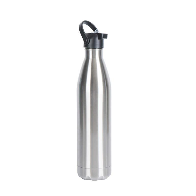 Questa è una bottiglia d'acqua in acciaio inossidabile da 750 ml. Ha un aspetto elegante e metallico e una maniglia nera sul cappuccio per un facile trasporto, adatto a varie occasioni come attività all'aperto o uso quotidiano.