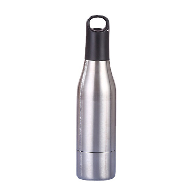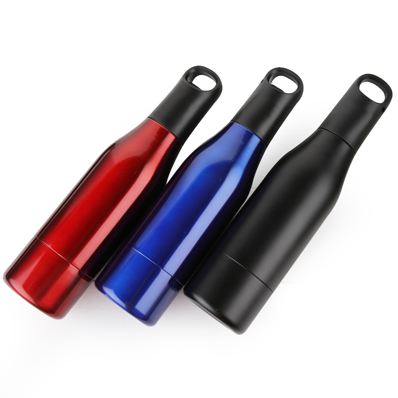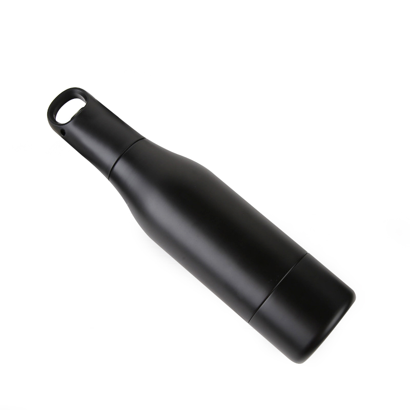 Con una capacità di 500 ml e una forma a bottiglia, la parte superiore ha un coperchio nero con manico ad anello. Il design complessivo è semplice e facile da trasportare. Questo tipo di contenitore può essere utilizzato per bevande in bottiglia e ha la funzione di mantenere freddo. È adatto per l'uso nel tempo libero e può offrire comodità per l'esperienza del bere.