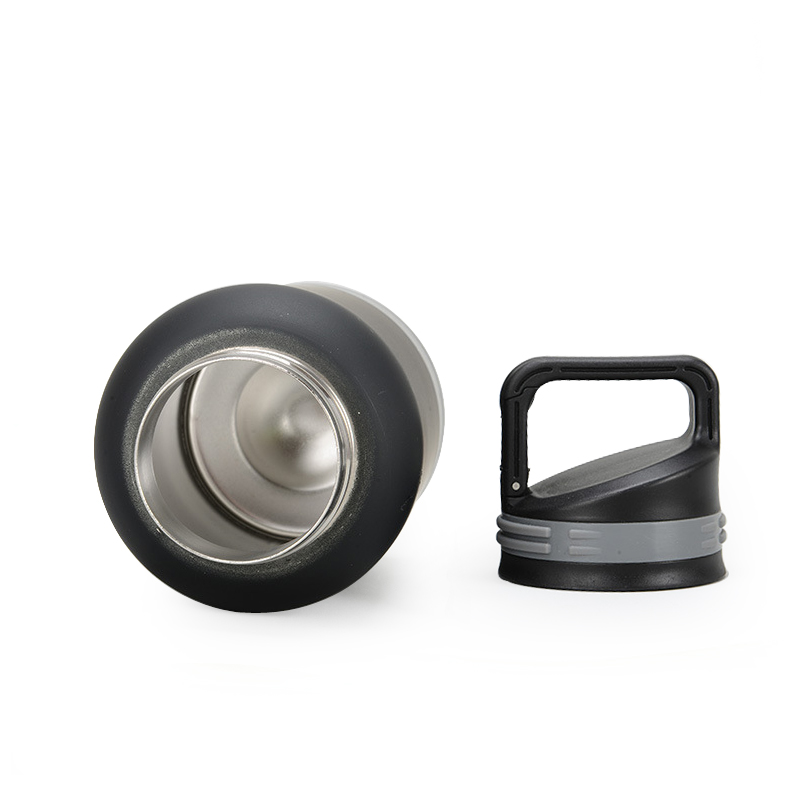 Questa è una parte di una bottiglia d'acqua isolata, con una fodera interna in acciaio inossidabile. La fodera ha una lucentezza metallica. Accanto ad esso c'è un coperchio con una maniglia. La fodera interna in acciaio inossidabile è benefica per la conservazione del calore, la resistenza alla corrosione e la garanzia dell'igiene e della qualità dell'acqua potabile.