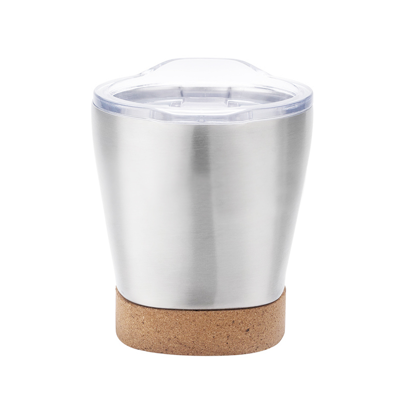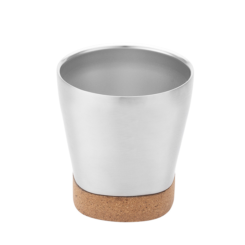 Realizzata in acciaio inossidabile, questa tazza presenta una silhouette elegante e fluida con contorni arrotondati. La sua base incorpora una base di sughero marrone morbida che crea un sorprendente contrasto con il corpo della tazza metallica sia nel materiale che nel colore. Questo design non solo aggiunge un ambiente naturale e caldo, ma eleva anche l'estetica generale con una sofisticata semplicità, rendendolo abbastanza versatile da integrare varie preferenze di stile.
