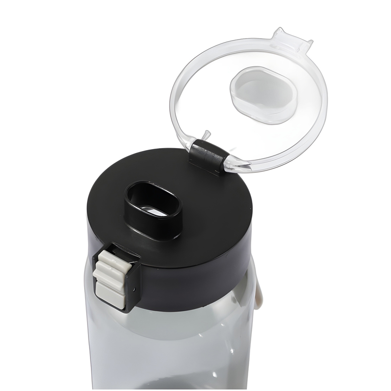 Queste foto dettagliate mostrano il tappo e la bocca di una bottiglia d'acqua. Il tappo presenta un comodo design flip-top con un meccanismo di bloccaggio sicuro, che garantisce prestazioni a prova di perdite. C'è anche un pratico anello per il trasporto per un facile trasporto. L'imboccatura della bottiglia ha un design ampio e liscio, che semplifica il riempimento con acqua o l'aggiunta di cubetti di ghiaccio ed è anche facile da pulire.