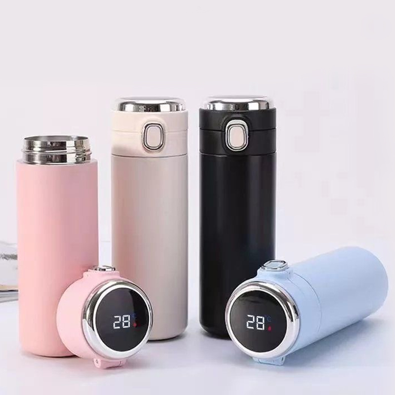 Queste boccette Thermos sono disponibili in una varietà di colori affascinanti, tra cui azzurro, rosa, beige e nero. Una delle loro caratteristiche eccezionali è il display di temperatura costruito. Come mostrato nella foto, è possibile controllare facilmente la temperatura del liquido all'interno, con letture come 56 ° C e 28 ° C chiaramente visibili.